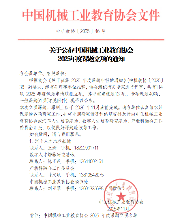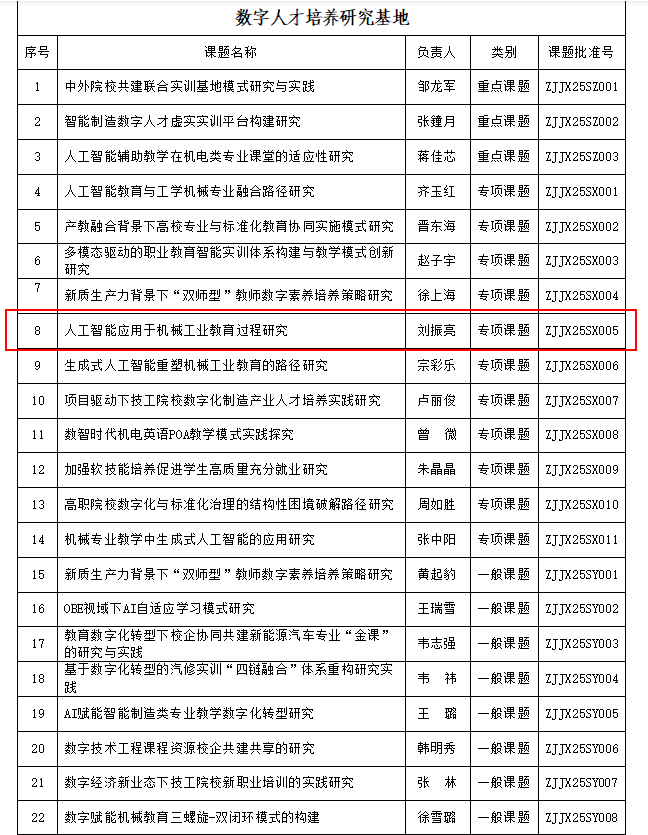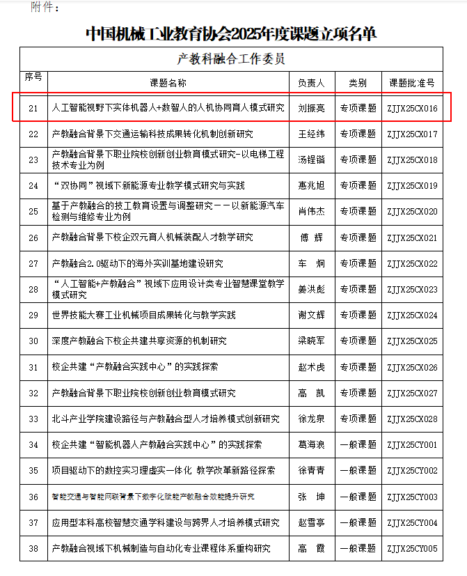 近日,由我校科研处与智能制造学院联合申报的《人工智能视野下“实体机器人+数智人”的人机协同育人模式研究》《人工智能在机械工业教育过程中的应用研究》两项课题,成功获批中国机械工业教育协会“2025年度产教科融合课题”与“数字人才培养研究基地”立项。课题由科研处刘振亮主持。