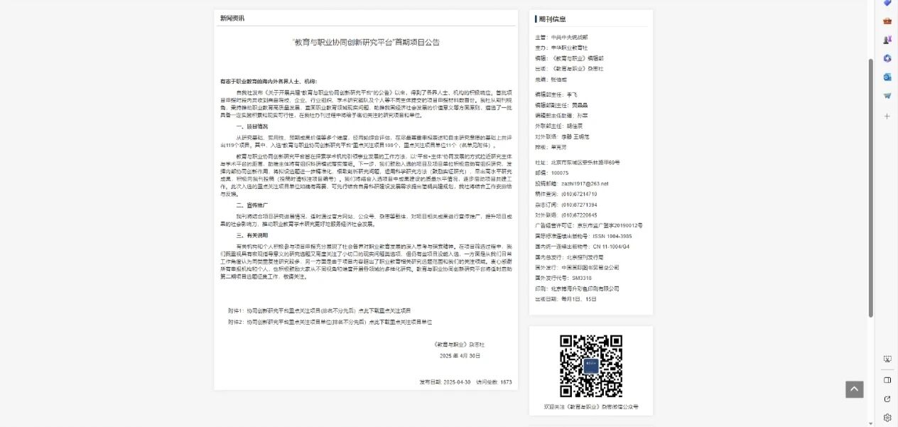 该平台由我国创刊最早、历史最久的职业教育期刊——《教育与职业》杂志主办。