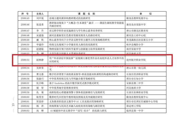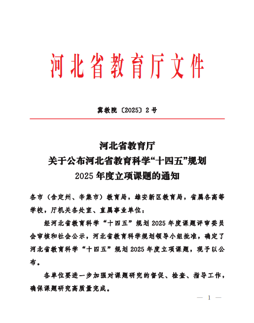 近日,河北省教育厅正式公布河北省教育科学“十四五”规划2025年度立项课题名单,我校两项课题成功获批立项。