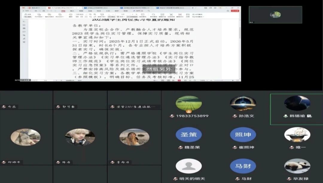 近日,智能制造学院2023级辅导员通过腾讯会议集中开展岗位实习线上关怀活动,为岗位实习学子梳理实习要点、筑牢安全防线,送上 “云端” 温暖与指引。