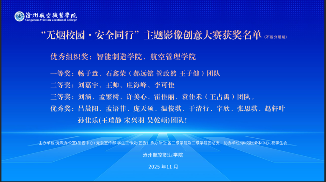 传递无烟校园理念,筑牢校园安全防线。11月26日,由沧州航空职业学院党政办公室(品宣中心)、党委宣传部、学生工作处联合主办的“无烟校园·安全同行”主题影像创意大赛颁奖仪式在崇德楼报告厅举行。学校领导、师生代表共200余人齐聚现场,共同见证这场以 “无烟校园” 为核心的创意盛宴与青春践行!