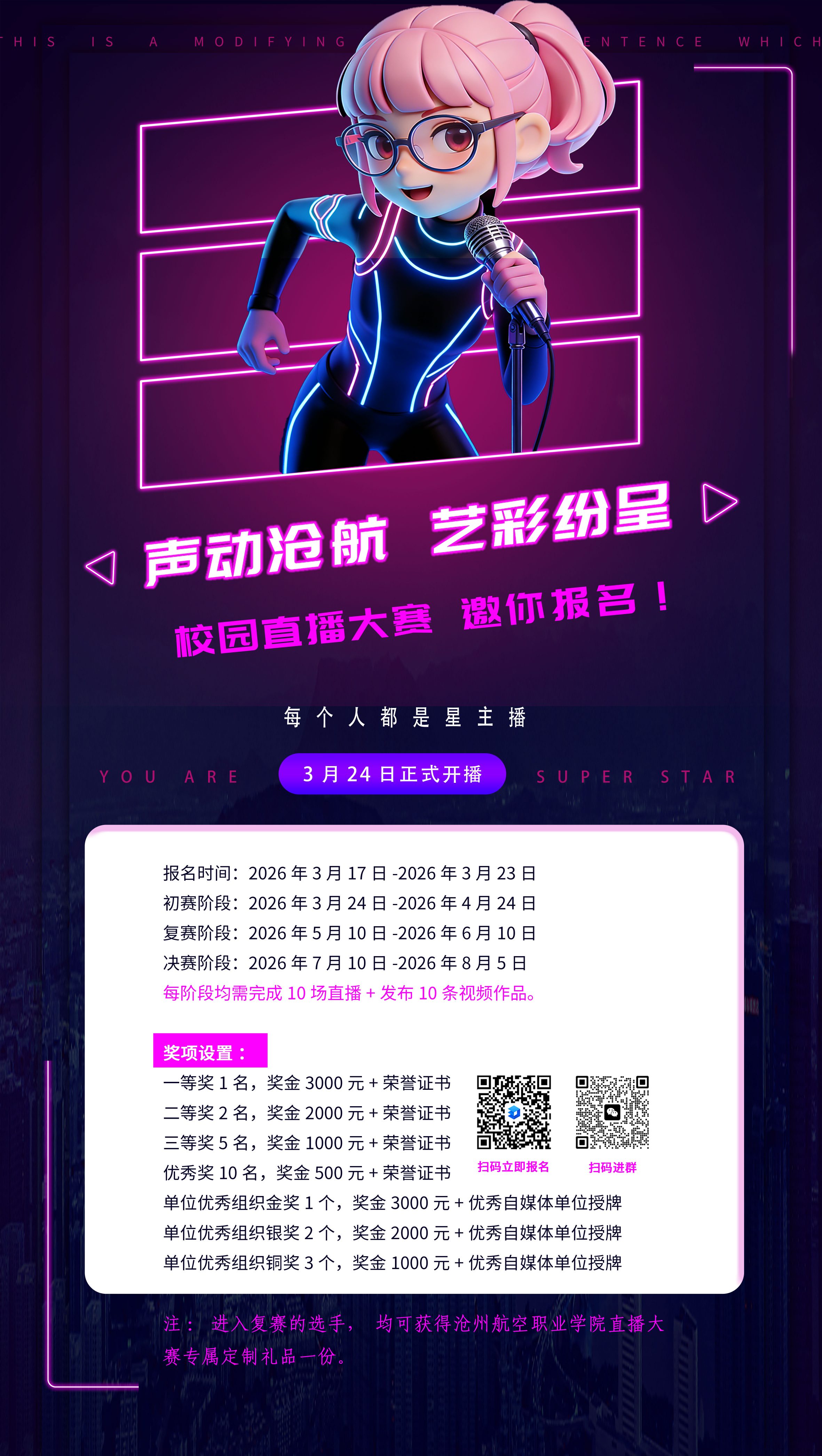 声动沧航,艺彩纷呈!亲爱的老师们、同学,无论你是整理大师、美妆达人、游戏大神,还是知识分享爱好者,都可以在这里尽情展示。无需专业设备,一部手机就能开启你的直播之旅,丰厚奖金与沧航官方认证证书等你来拿。在这里,用镜头讲述校园故事,让创意打破次元壁垒!