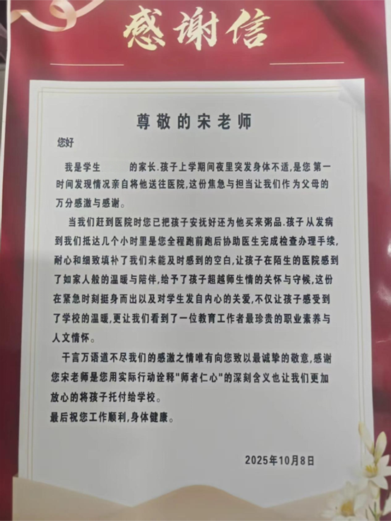 该名辅导员全程陪同学生直至次日早上九点半,待家长赶到医院、确认学生转危为安后,才离开医院返回学校继续工作。家长深受感动,事后特地送来感谢信和锦旗表达谢意。