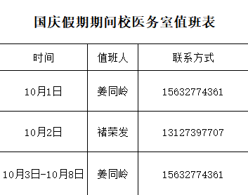 为保障假期期间在校师生的正常生活,自2025年10月1日起至10月8日,学校食堂营业安排及医务室值班表公示如下:
