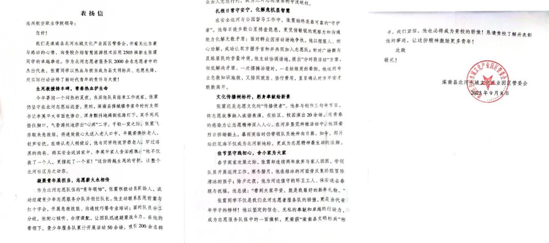 近日,我校收到一封来自滦南县北河水城文化产业园区管委会的表扬信,信中详细记述了智慧旅游技术应用2505班新生张震在暑期参与当地志愿服务中的突出表现。这位被当地誉为“县文明标兵”“志愿先锋”的新生,用一次次实际行动展现了新时代青年的责任担当。