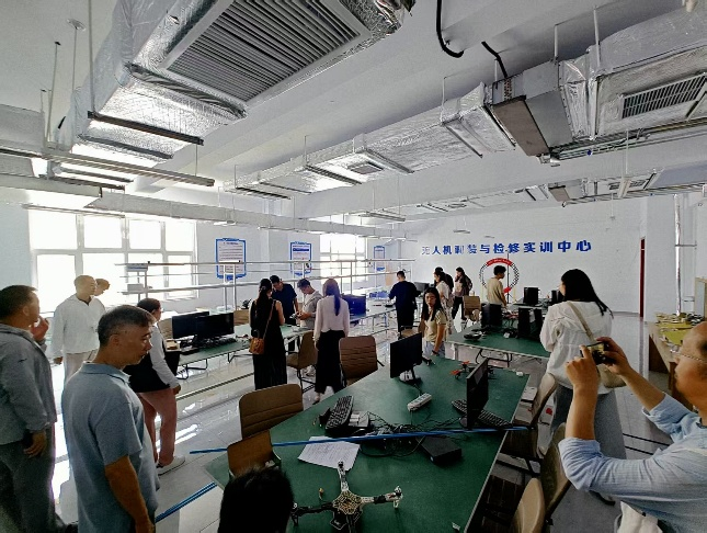 在德州科技职业学院,调研教师参观了波音737-800实训飞机及实训中心。实训飞机高度还原真实工作场景,凸显“具象化教学”优势。实训中心内,机场沙盘结合空管指令实现运行过程具象化;钣金、铆接等实训平台及工具库管理模式严格对标机务实际流程;沉浸式虚拟仿真系统为无人机拆装、发动机原理展示等提供了创新教学参考。
