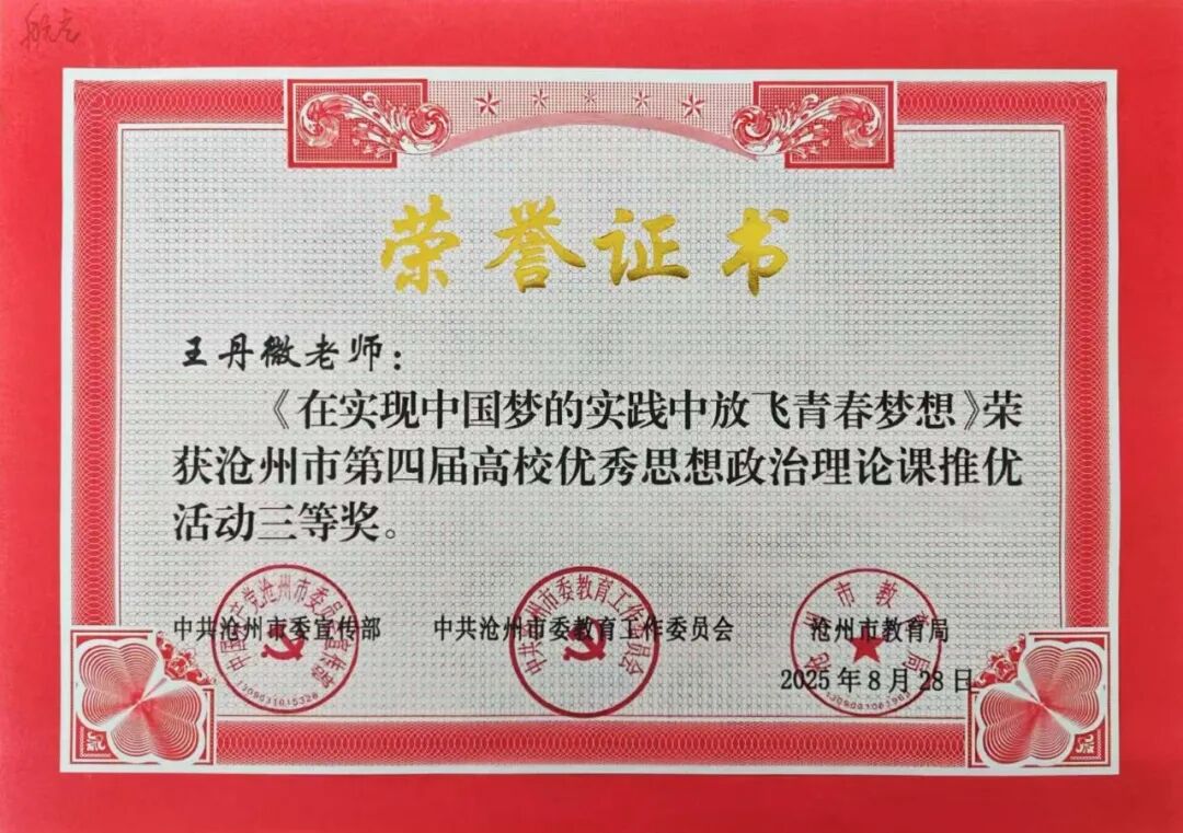 近日,由中共沧州市委宣传部、中共沧州市委教育工委、沧州市教育局联合举办的沧州市第四届高校优秀思想政治理论课评比大赛成绩揭晓。我校马克思主义教学部教师王丹微在比赛中表现突出,荣获三等奖。