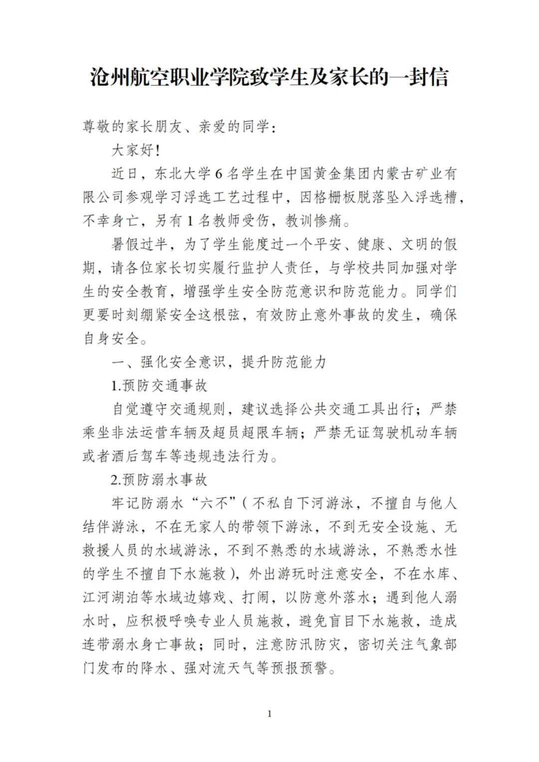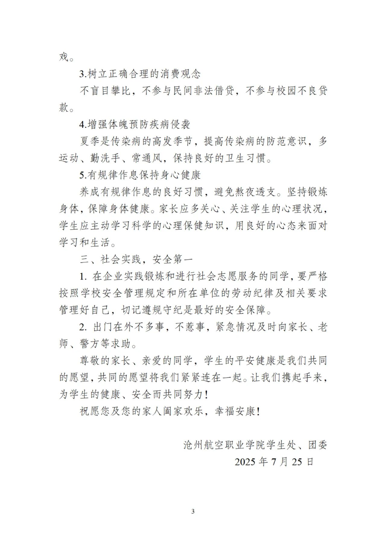 沧州航空职业学院致学生及家长的一封信