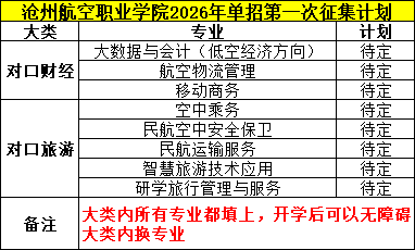 沧州航空职业学院2026年单招第一次征集计划