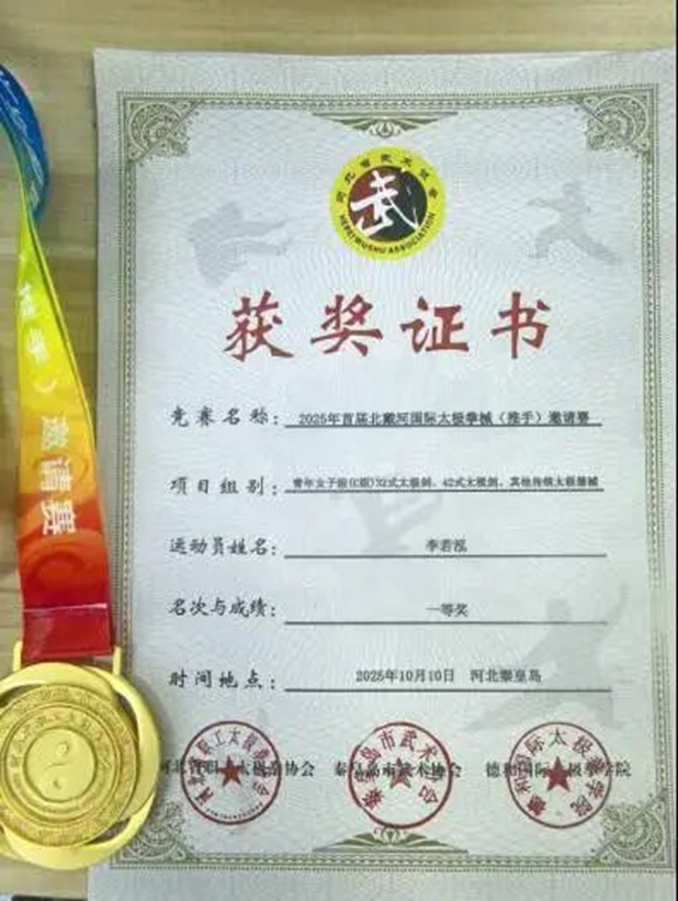 今年10月份在由秦皇岛市北戴河区教育和体育局、市武术协会联合主办的2025年首届北戴河国际太极拳(推手)邀请赛中,李若泓同学凭借扎实的功底和沉稳的临场表现,在强手如林的赛场上脱颖而出。她先后在青年女子组(C组)其他传统太极器械比赛中荣获一等奖,斩获金牌;随后又在普及广泛的24式太极拳项目中夺得二等奖,收获银牌。赛场上,她不仅以行云流水的动作诠释了太极的刚柔并济,更以优秀的武德与体育精神,为她所代表的秦皇岛市人民公园传统武术指导中心赢得了“道德风尚奖”