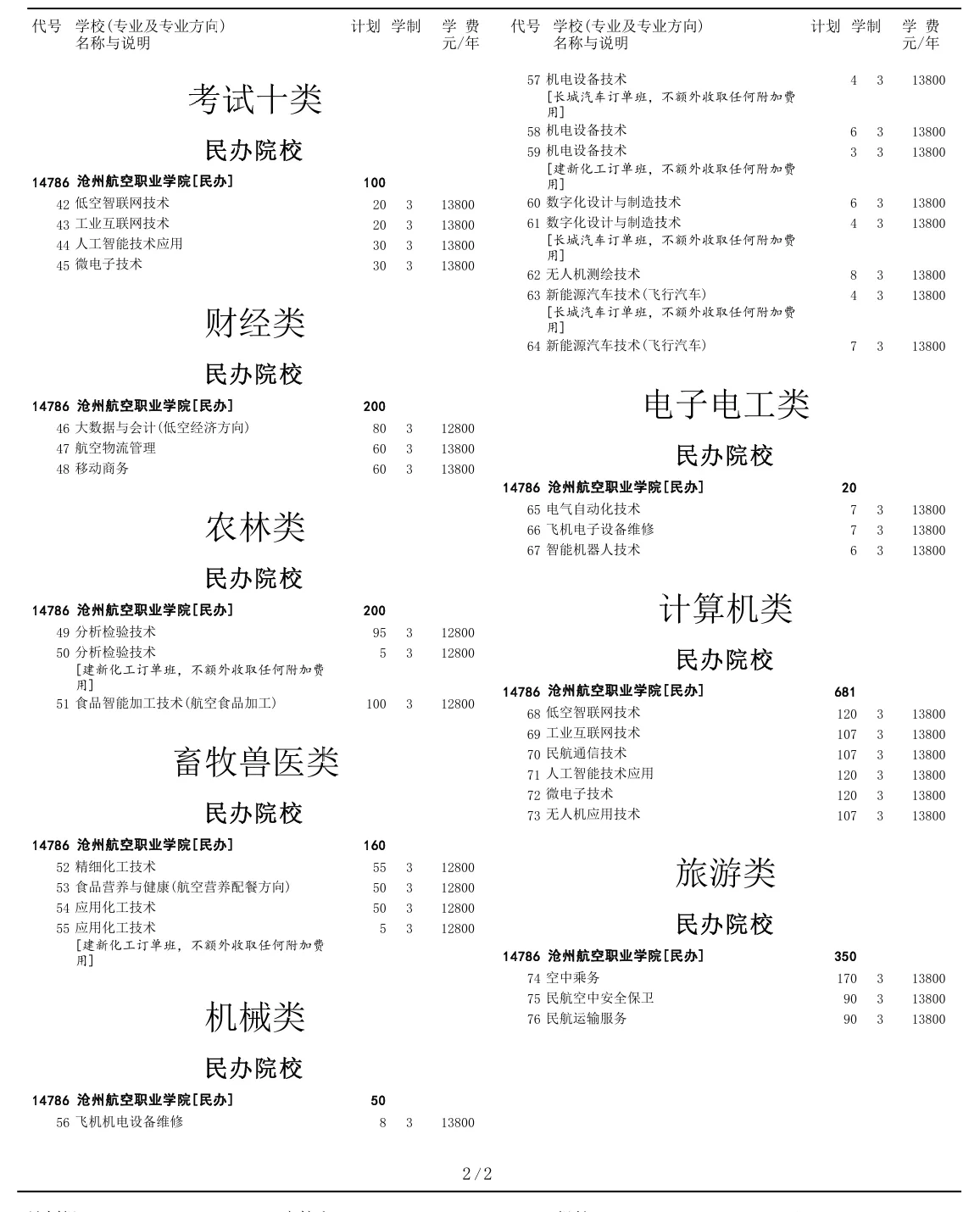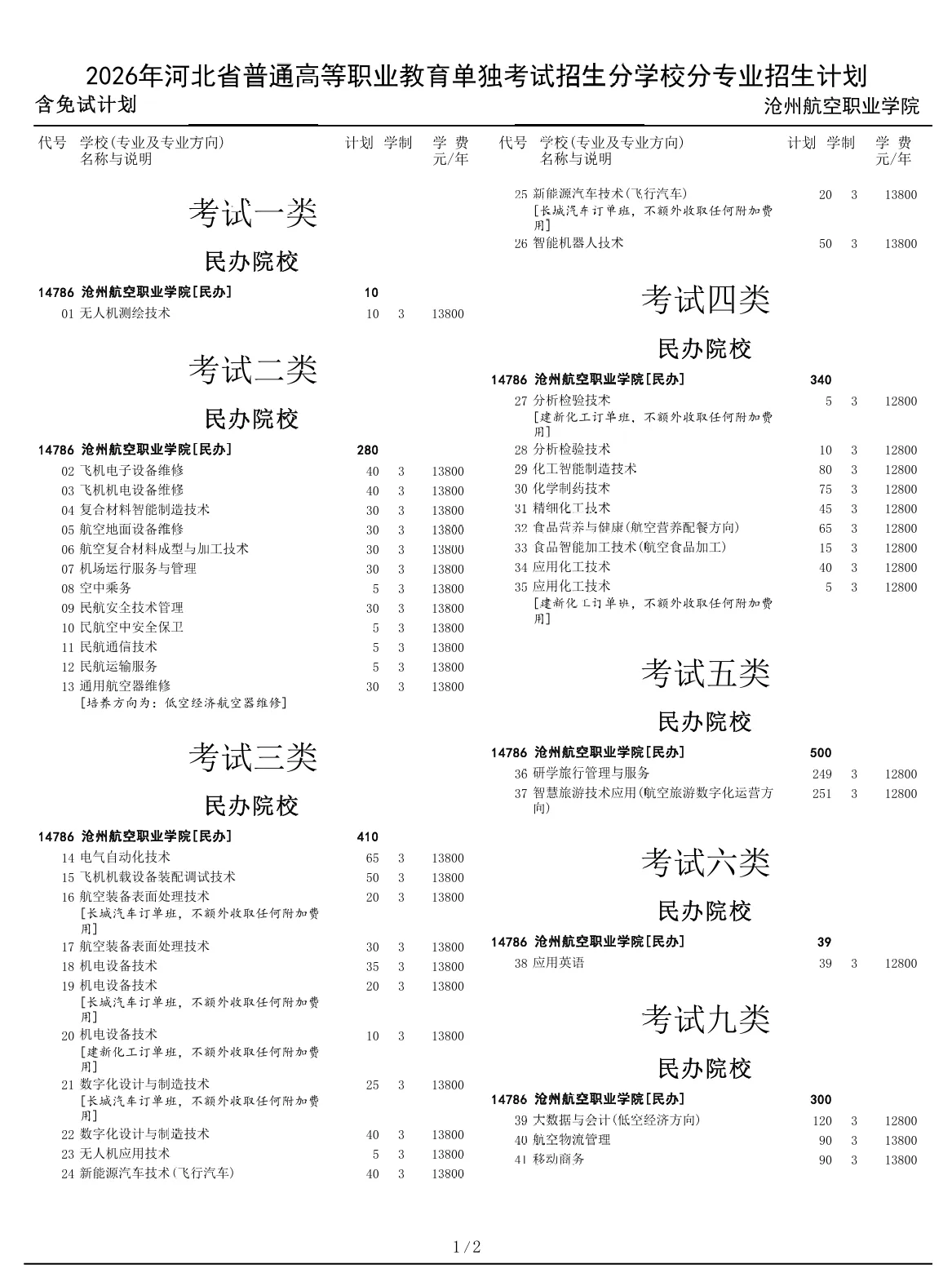 沧州航空职业学院2026年单独招生考试各类招生计划