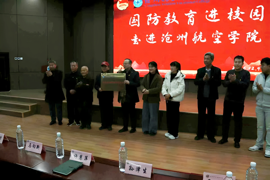 会上,赵振岗为黄骅市大赵村惨案遗址纪念馆颁发了“沧州航空职业学院思想政治教育研修基地”牌匾。