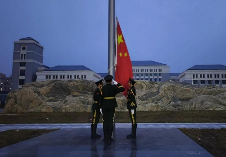 升旗仪式上,护旗手迈着整齐的步伐护送五星红旗至升旗台。伴随着雄壮的国歌声,五星红旗缓缓升起,全体师生肃立行注目礼,齐唱国歌。现场秩序井然,氛围庄重肃穆。