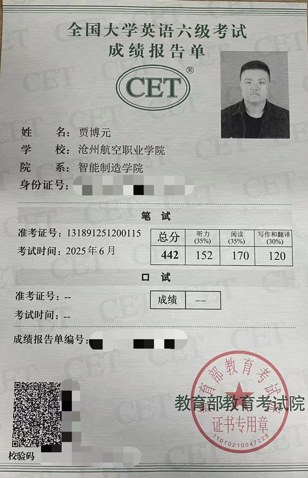 热烈祝贺智能制造学院机电2302班贾博元同学在全国大学英语六级考试中斩获佳绩,成功“解锁”英语能力新成就!