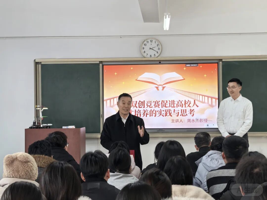 传承工匠精神、赋能专业发展,12月17日,智能制造学院在问学楼A307成功举办“以双创竞赛促进高校人才培养的实践与思考”主题凌云大讲堂活动。副校长孙维连、学生处顾问昝久占出席开讲仪式并讲话,本次讲座特邀河北农业大学机电工程学院党委书记周永杰教授和孙铂教授担任主讲嘉宾,围绕“双创竞赛促进高校人才培养”和“科技创新竞赛类型和准备”两大核心议题,通过理论阐释、案例分析与互动交流,为现场参与的全体师生带来了一场兼具思想深度与实践价值的知识盛宴。
