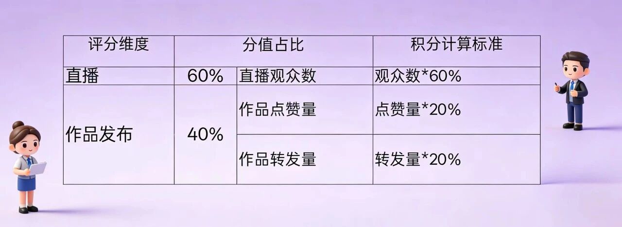 (3) 根据直播数据采用积分计算的方法排名,总排名前60%的选手进入决赛。评分标准如下: