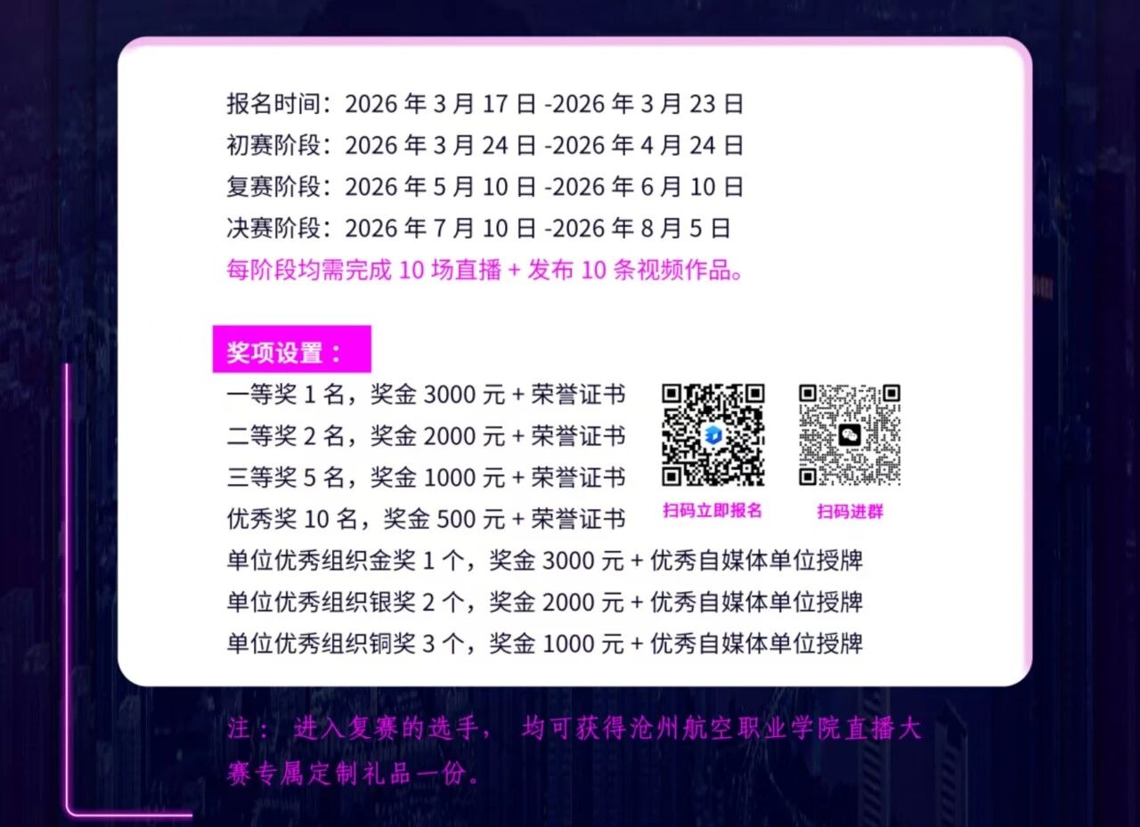 2.完成报名后,需在抖音APP内发布1条参赛预热短视频,带指定赛事话题#沧州航空职业学院校园直播大赛并@沧州航空职业学院、@沧州航空职业学院招生就业办 官方抖音账号,完成平台端参赛确认,未完成该步骤视为报名无效。